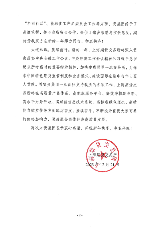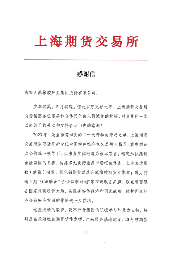 海南橡膠收到上海期貨交易所感謝信